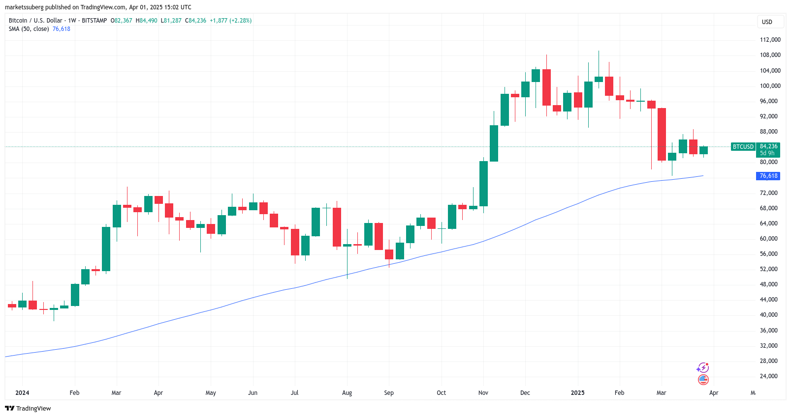 Popular trader Jelle noted BTC/USD respecting the 50-week simple moving average (SMA), currently at $76,600, as support.