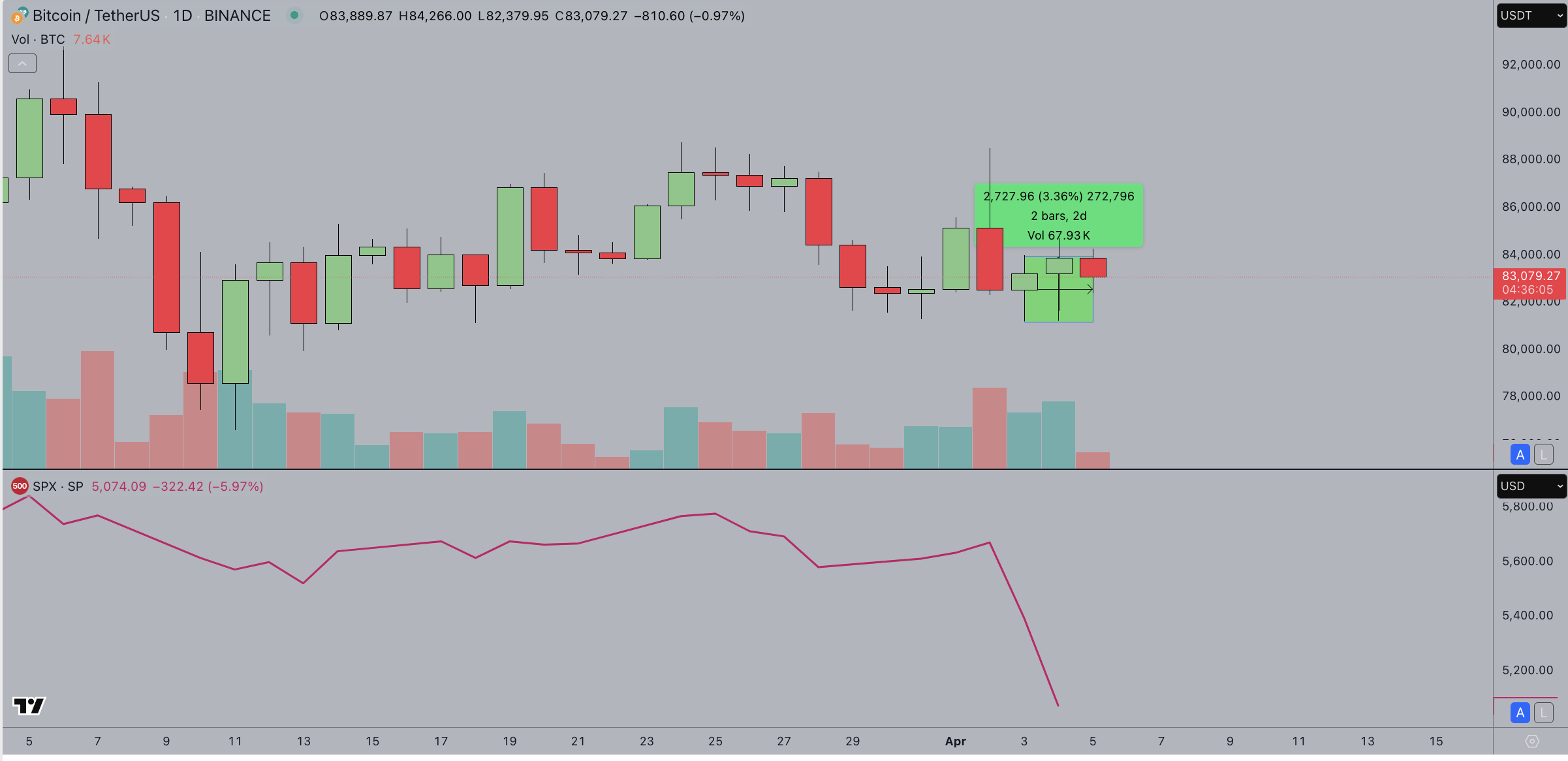 Despite Friday’s close at $83,100, a 0.94% daily loss, BTC continues to trade above the critical $83,000 support, resisting broader financial market turmoil driven by trade tensions between the U.S. and China.
