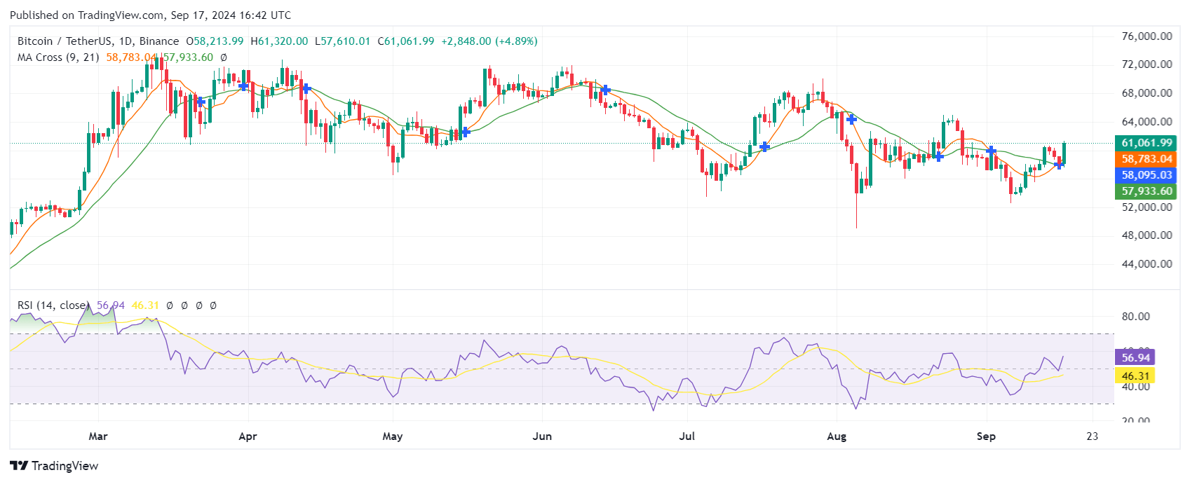 Bitcoin price has surged to its highest level in three weeks, triggering gains across the cryptocurrency sector and related stocks. It soared 5.6%, reaching $61.1K by 11:55 a.m. ET before pulling back to around $61k.