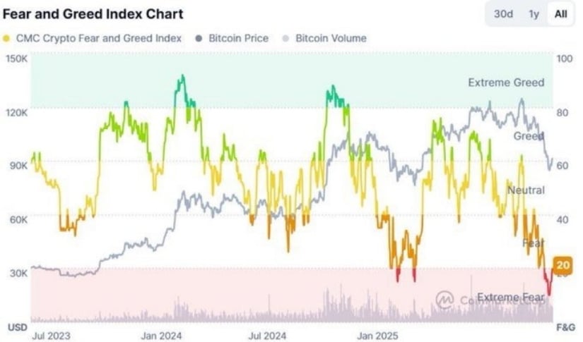 Market strategist Michaël van de Poppe (@CryptoMichNL) points out that the extreme fear reflected by the Fear & Greed Index at 20 often coincides with local market bottoms. He describes the recent BTC pullback as a “pricing disconnect” likely to correct toward fair value.