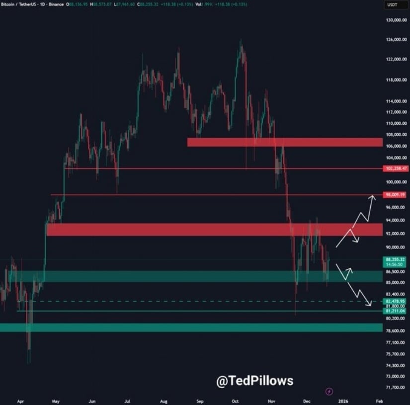 According to crypto analyst TedPillows (@TedPillows), Bitcoin is stabilizing around $88,000. He notes that reclaiming the $89,000–$90,000 range could open the path toward $94,000, while failure to defend the $88K pivot might prompt a retest of $85,000 support.