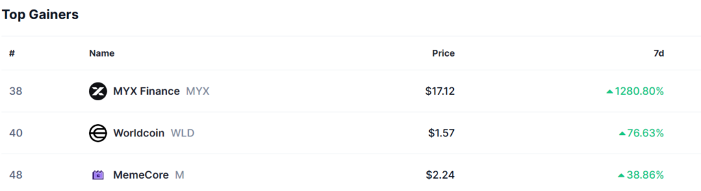 MYX Finance (MYX) was the leading gainer this week among the top 100 altcoins, surging 1,280% and massively outpacing other tokens. Worldcoin (WLD) and MemeCore (M) followed with more modest gains, rising 76% and 38%, respectively.