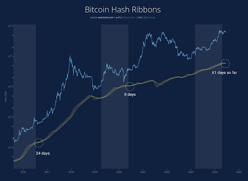 Meanwhile, Willy Woo also highlighted how Bitcoin’s hash rate recovery has taken much longer in this cycle compared to previous cycles. He stated that BTC’S hash rate took only 24 and 8 days to recover in the 2017 and 2020 market cycles. However, this time around, it is over 61 days, and Bitcoin’s hash rate has yet to recover.