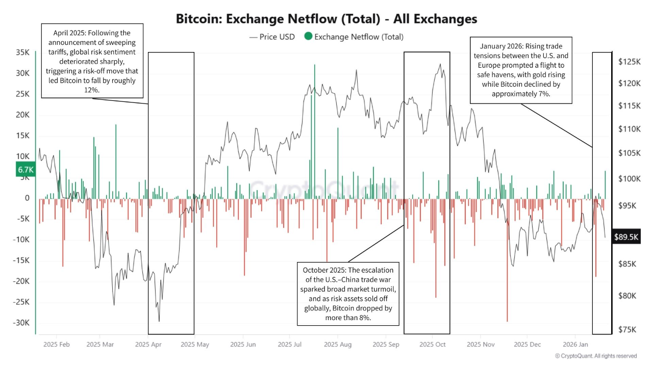 Since 2025, several Bitcoin downturns have coincided with periods of heightened trade tension and tariff hikes. During these phases, Bitcoin moved lower alongside equities, supporting the view that it is still treated as a macro-sensitive asset rather than a defensive hedge.