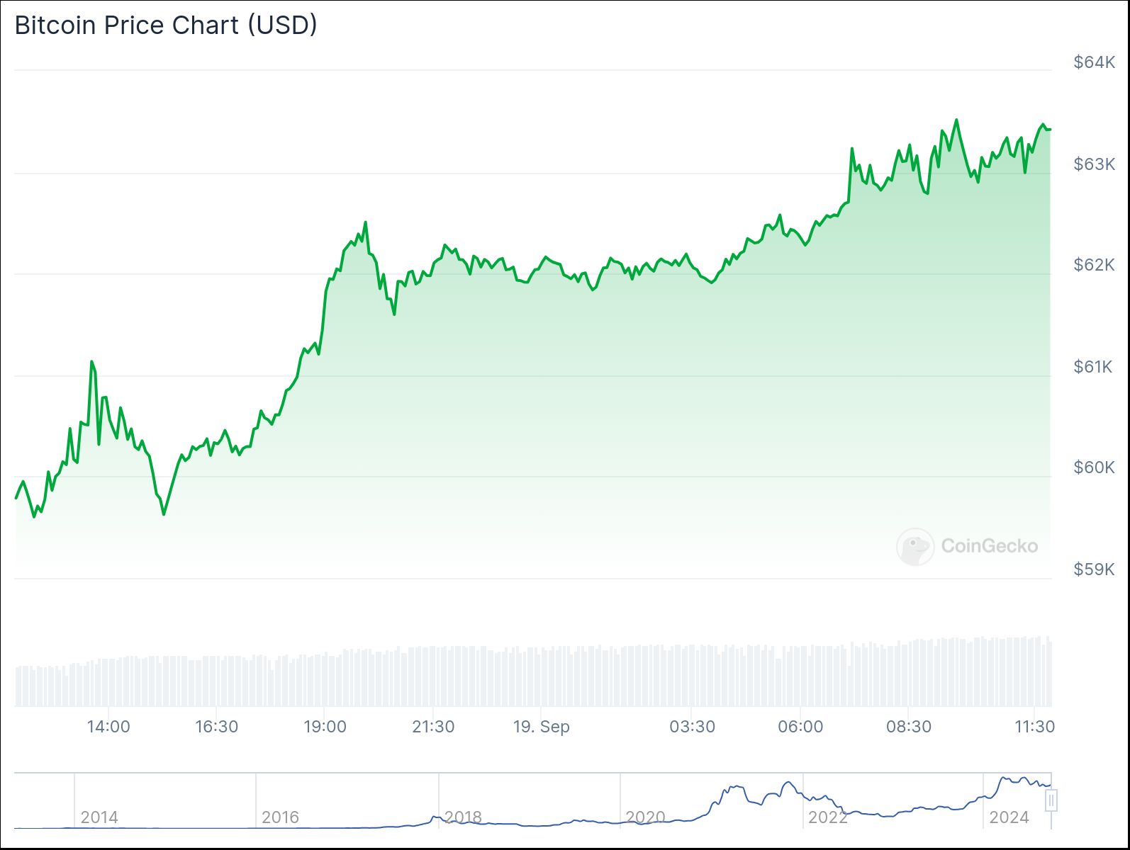 Bitcoin is trading near $63,000, up 6% in the last 24 hours after the Federal Reserve’s decision to cut its benchmark interest rate by 50 basis points. This move has also lifted the overall crypto market, with the total market cap rising 2% in response.
