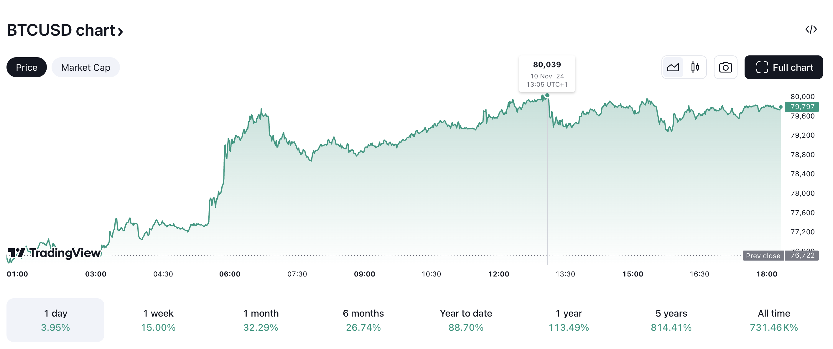 Bitcoin (BTC) just jumped over 10%, hitting an all-time high of $80,039. This rise seems tied to news of Donald Trump’s strong showing in the U.S. election, with Trump currently leading with 198 seats compared to Kamala Harris’s 112, according to the Associated Press. Many investors are hopeful due to Trump’s crypto-friendly stance, which has boosted both Bitcoin and several other cryptocurrencies.