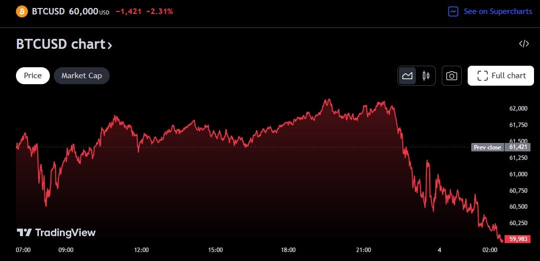 - US job market downturn and high unemployment rate trigger Bitcoin’s fall to $60,000.