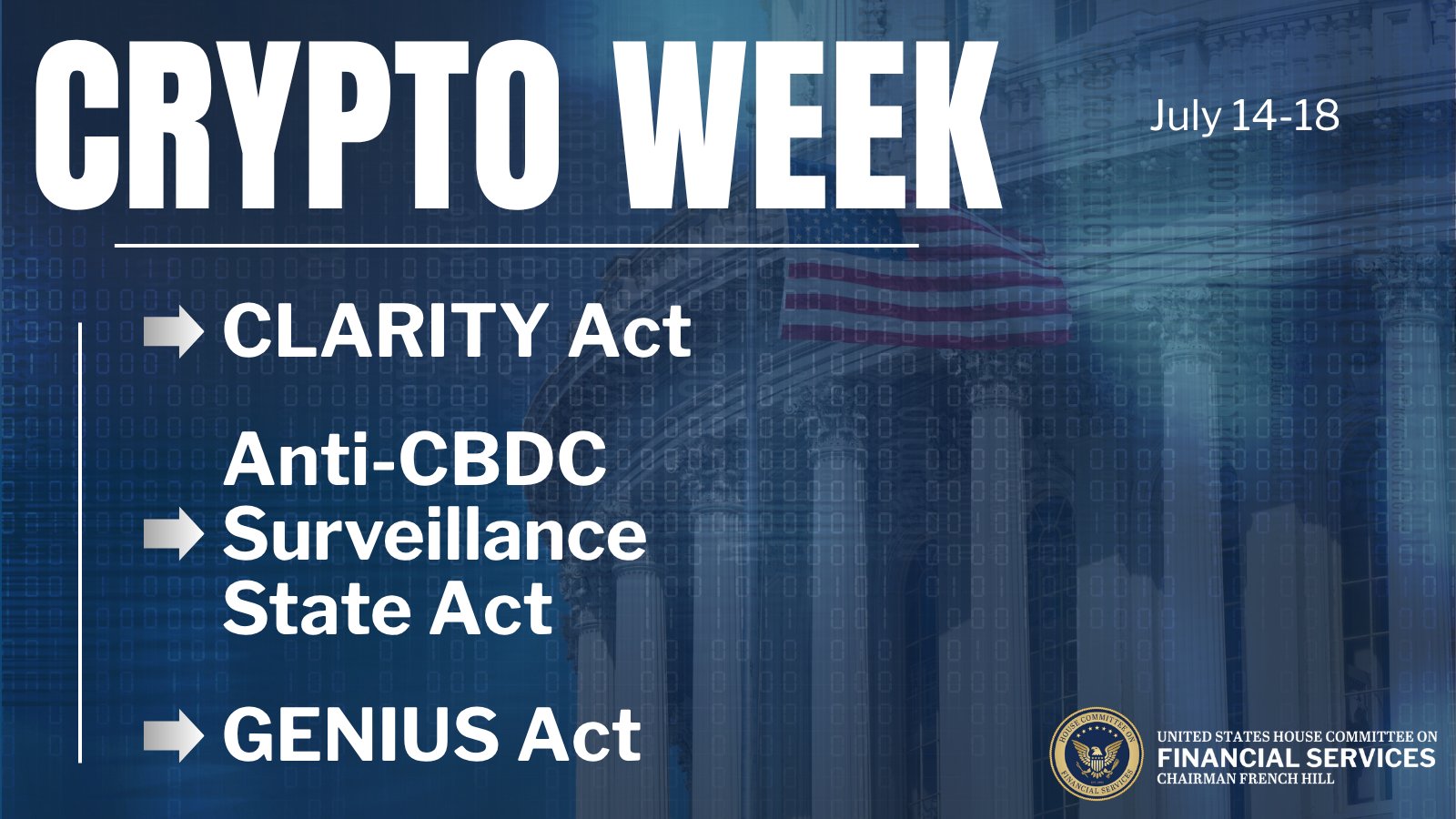 The US House Financial Services Committee has designated the week beginning July 14 as “Crypto Week,” during which lawmakers will debate three key bills aimed at providing clear regulatory frameworks for digital assets, stablecoins, and blockchain technologies.