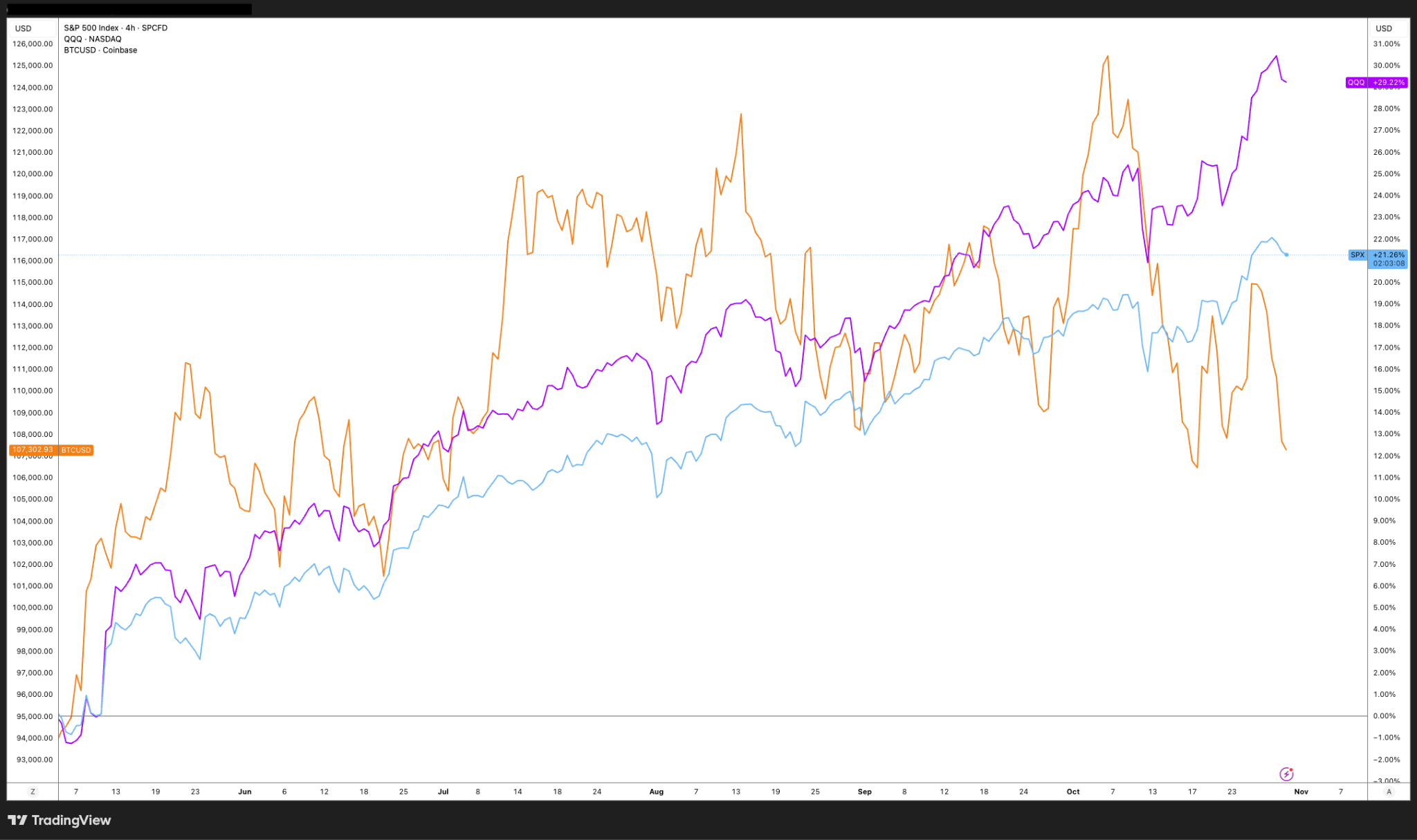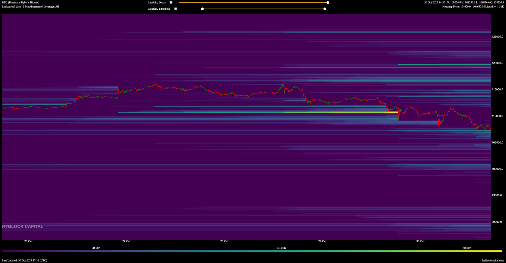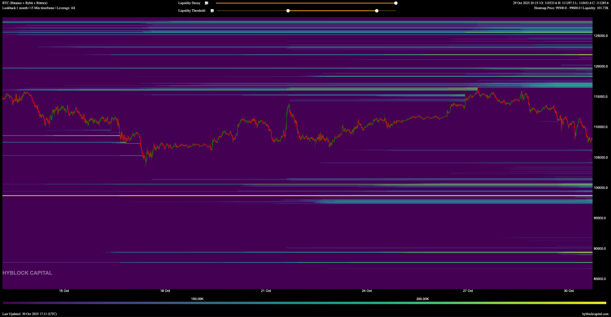 Bitcoin’s (BTC) end-of-month sell-off accelerated as the price dropped to $107,328 shortly after the New York open and was followed by an intraday low at $106,800. The move mirrors a slight weakness in US stock markets, where the S&P 500 and Nasdaq showed slight losses despite third-quarter earnings from Big Tech companies surpassing expectations.