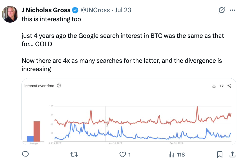 Others commented on the long-term viability of Bitcoin and understood Woo’s reasoning. However, one user pointed out the contrasting difference between the search traffic of Bitcoin and Gold: