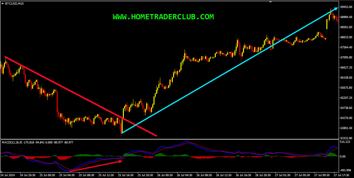On the M15 chart, the market provided us with various facts supporting the bullish view. The price which was moving lower created a bullish divergence between the first low that has formed at 63804.45 and the second low that has formed at 63439.34 based on the MACD indicator. The price then moved higher and broke above the most recent downtrend line, we may consider these as facts provided by the market supporting the bullish view. Then as you can see in the image below how the price moved higher after that and provided a nice move to the upside!