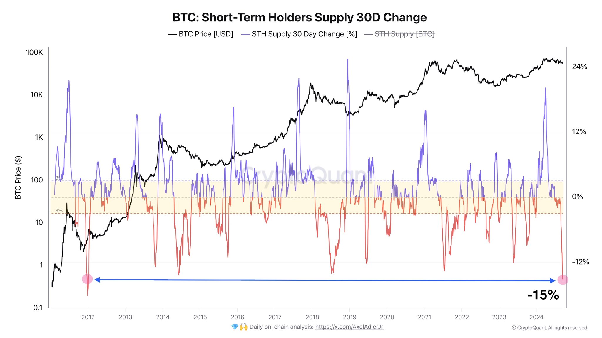 As explained by CryptoQuant author Axel Adler Jr in a new post on X, the 30-day change in the short-term holder supply has plunged deep into the negative territory recently.