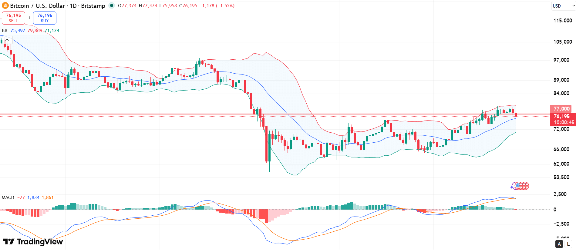 Also, technical indicators show increasing weakness. The MACD histogram has turned red, indicating that bullish momentum is fading. Bitcoin has fallen 2% today after already dropping 1.64% yesterday. At present, BTC trades at $76,195, with immediate support near the middle Bollinger Band at $75,497.