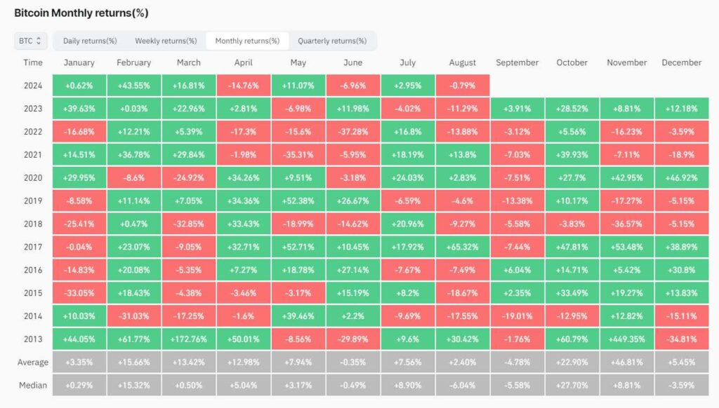 For instance, September has often been marked by profit-taking after summer rallies, leading to price corrections. Additionally, the overall volatility of Bitcoin, influenced by macroeconomic conditions and regulatory developments, tends to amplify these downward pressures during this month.Analyzing the broader context, Bitcoin’s performance in September contrasts sharply with other months, where it has frequently experienced substantial gains.