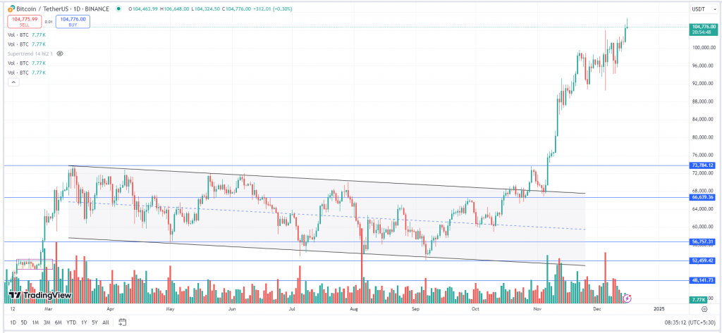 BTC broke the psychological resistance level of $100,000 on 5th December and rallied up to $104,088. The asset made a ‘Spinning Top’ candle that indicated indecision. Post this move, BTC started to consolidate between $94,500 to $102,500 with declining volumes. It has given a breakout above the range and made a new all-time high of $106,648 but with low volumes. To witness further rally, BTC needs to close and sustain above $104,000.
