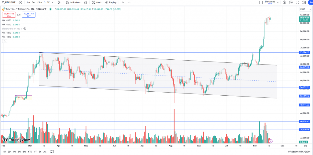 BTC, after making the all time high of $73,777, was trading in the ‘Descending Channel’ pattern. The asset gave a massive breakout above the channel and made a new all time high surging up to $93,265. Post this move, on a daily time frame, BTC is consolidating and trading in a range from $86,000 to $90,800. To further rally, it needs to break and sustain above $93,265 whereas $85,000 will now act as a strong support for the asset.