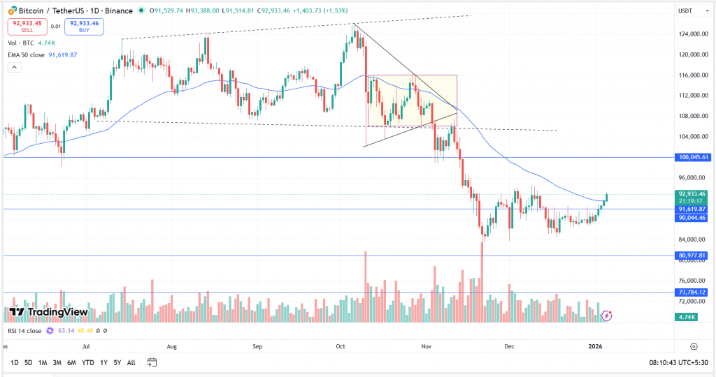 BTC has traded in the green for the past five consecutive days, forming a “higher high, higher low” pattern. However, to sustain a broader rally, it needs to break above and hold the key resistance levels of $95,000 and $100,000.