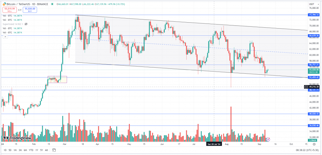 BTC continues to trade in a ‘Descending channel’ pattern, where the upper downsloping line is acting as the resistance and the loewe downsloping line is the support. The lower longer shadows, around $52,000, indicate buying around these levels. Once BTC gives a breakout above the Descending channel pattern, then we may expect the prices to rally and cross the previous all time high of $73,777. The asset has a strong support zone from $52,000 to $48,00, whereas $56,000 & $62,500 will act as a strong resistance
