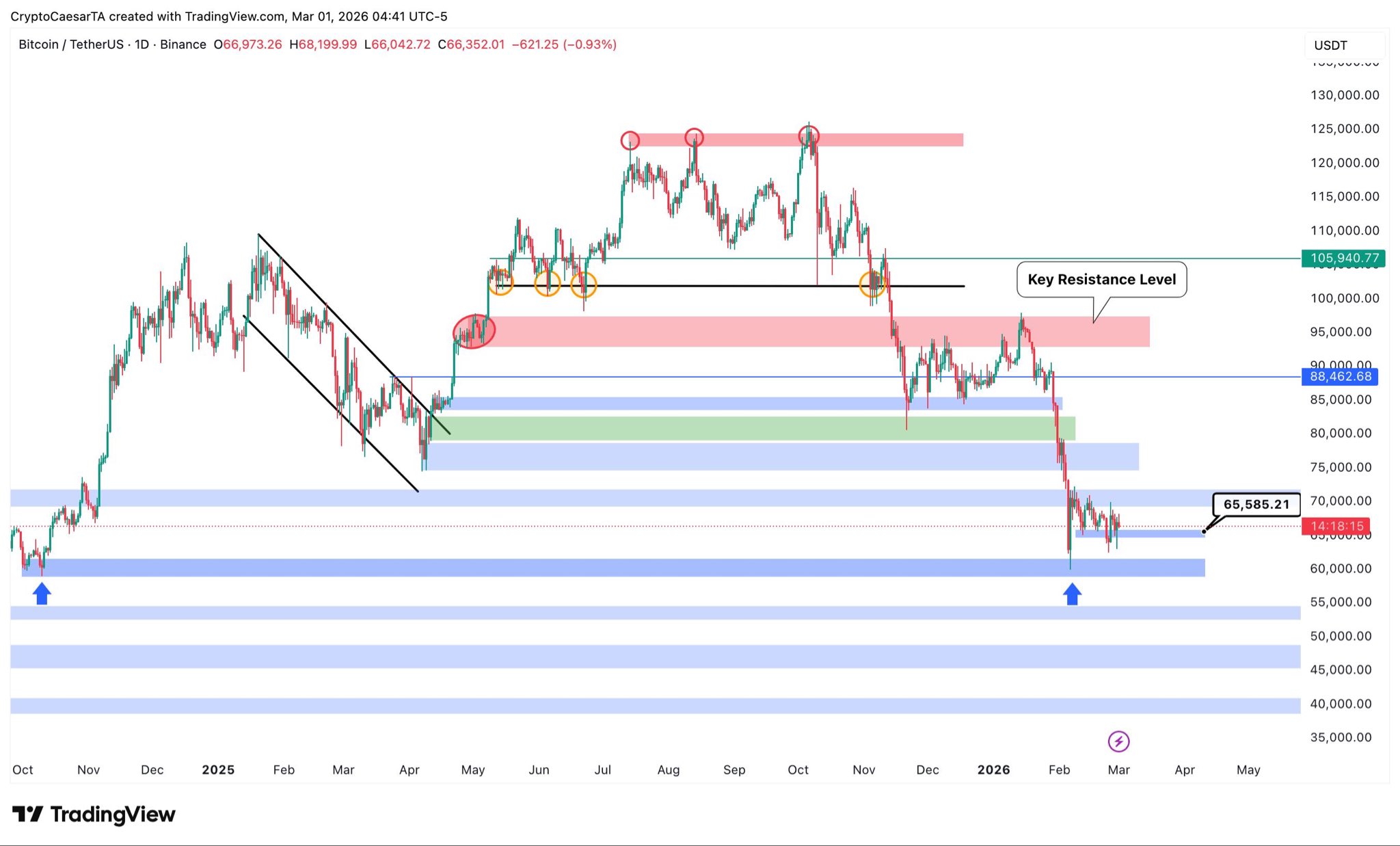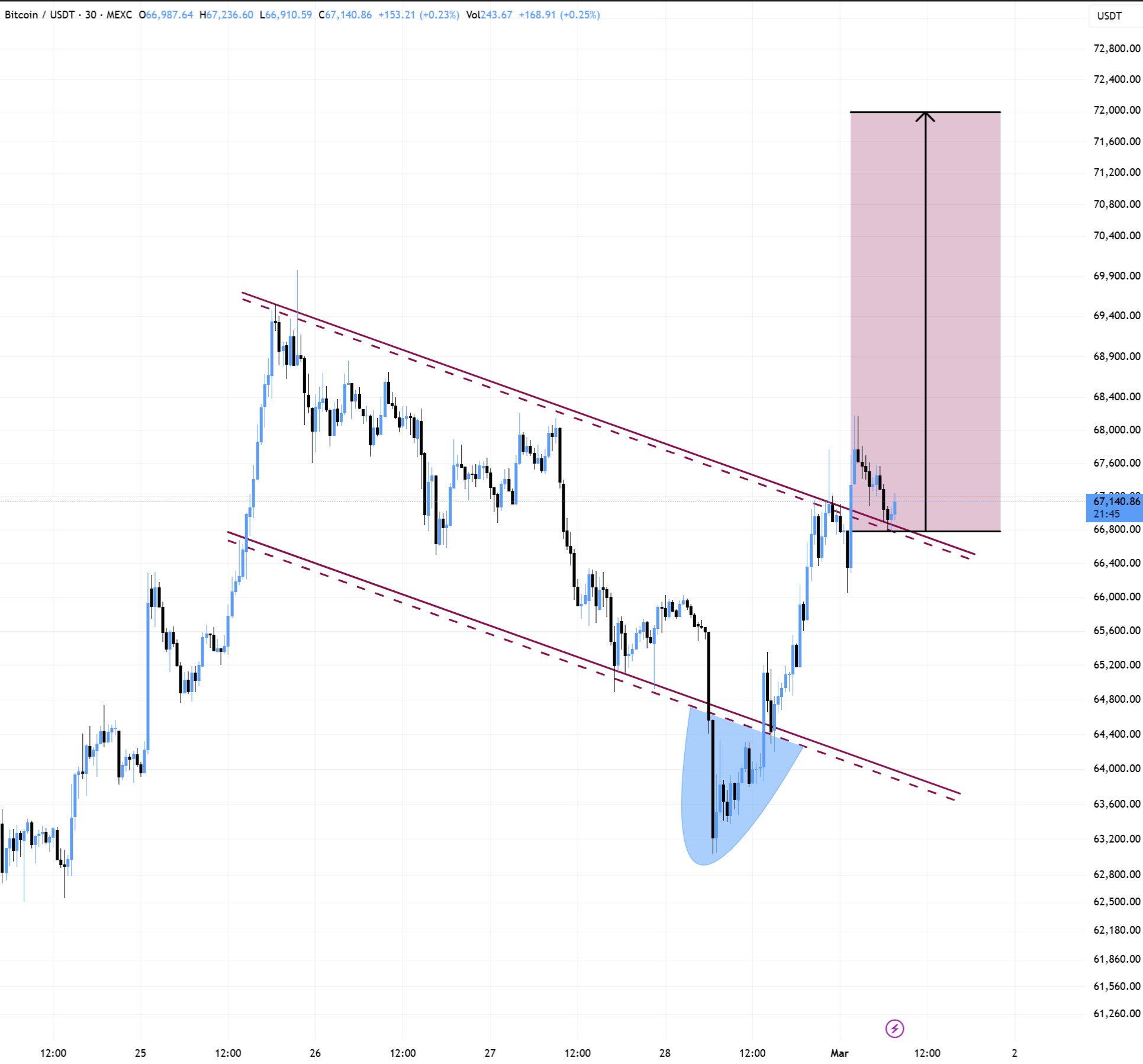 “Deviation below the support zone and has now flipped resistance into support. I think a rally towards the $73K-$74K level could happen.”