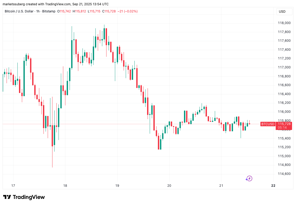Data from Cointelegraph Markets Pro and TradingView showed BTC/USD hovering below $116,000.