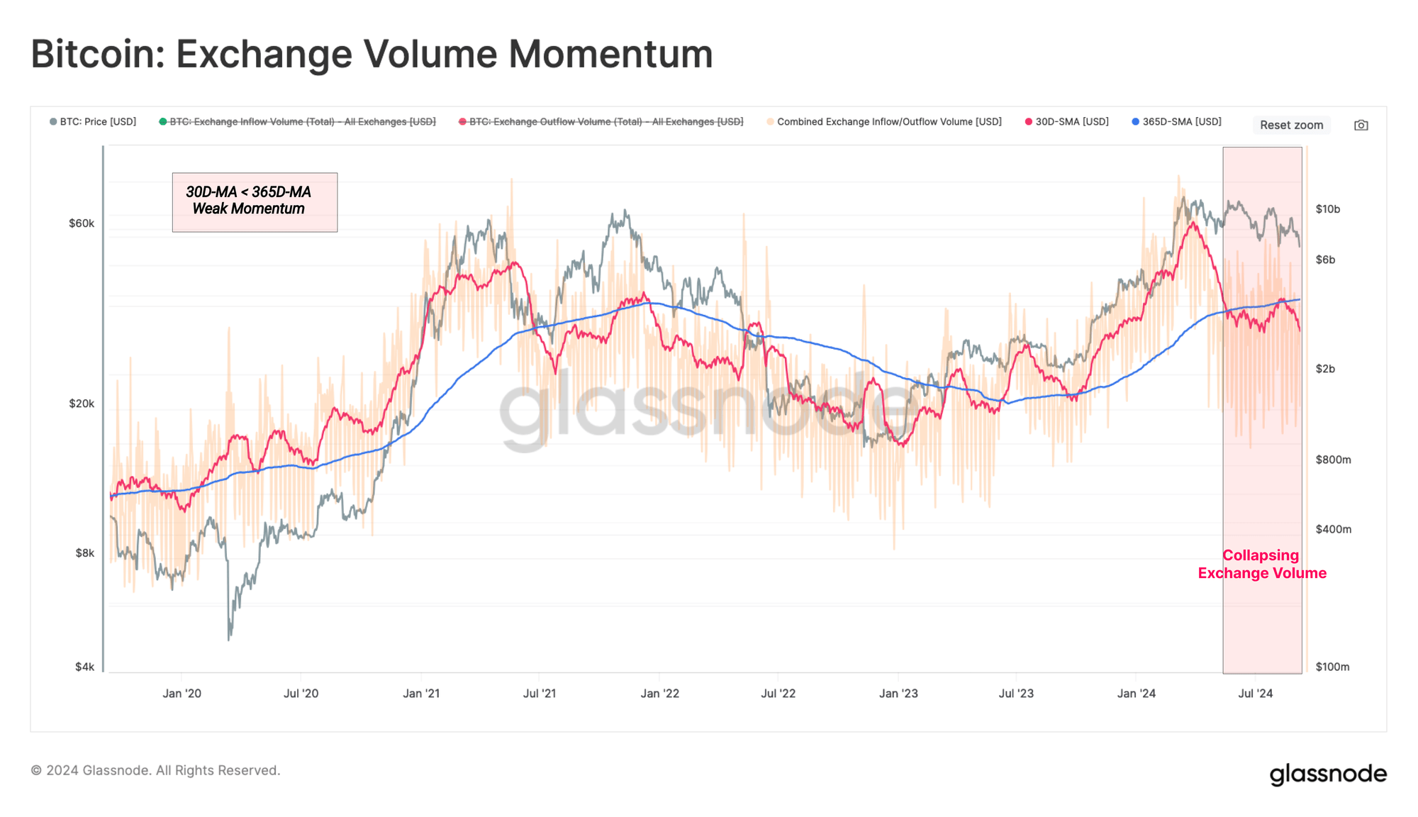 The trend in the the Exchange Volume Momentum for BTC over the last few years | Source: Glassnode's The Week Onchain - Week 37, 2024