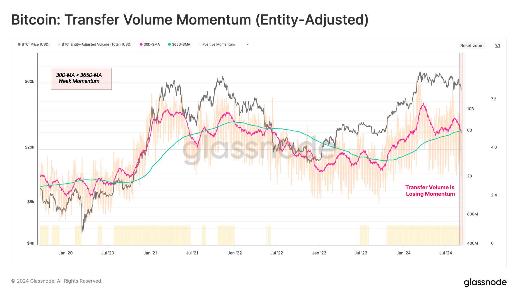 A report from Glassnode has revealed that the Bitcoin transfer volume has been losing momentum recently, a sign that may not be positive for BTC.