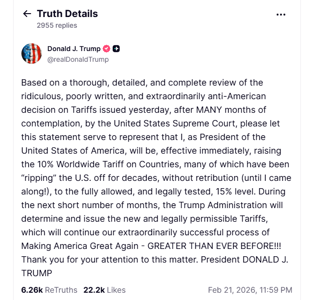 “As President of the United States of America, I will be, effective immediately, raising the 10% worldwide tariff on countries, many of which have been ‘ripping’ the US off for decades, without retribution, until I came along, to the fully allowed, and legally tested, 15% level.”