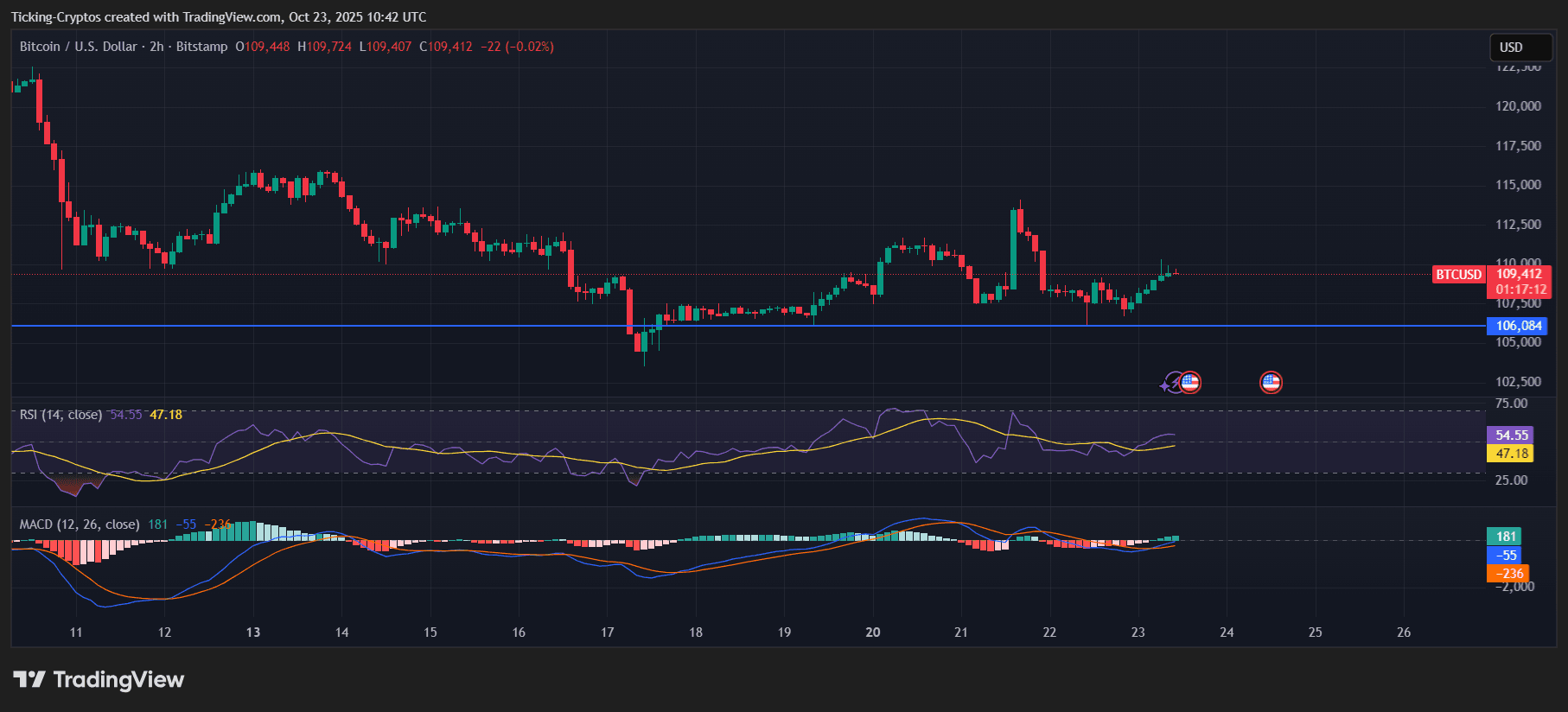 Der $BTC/USD-Chart zeigt starke Unterstützung nahe 106.000 $, ein Niveau, das diese Woche mehrfach getestet wurde. Der Widerstand liegt zwischen 110.000 $ und 112.000 $, wo frühere Rallyes abgelehnt wurden.