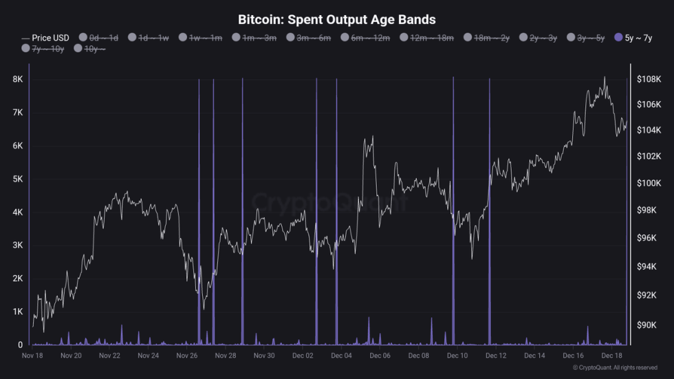 Top analyst Maartunn shared on-chain data showing significant whale activity, including the total movement of over 72,000 BTC. Notably, 8,000 BTC, aged between 5 and 7 years, were moved on-chain in a recent transaction.