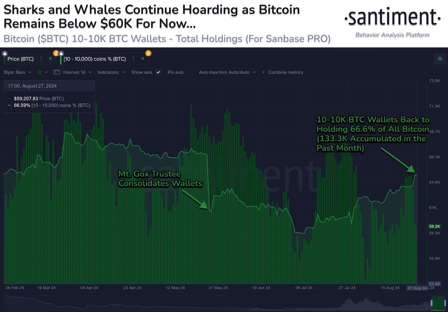 As of August 28, the firm noted that whales and slightly smaller holders, known as “crypto sharks” (those with at least ten BTC), had collectively purchased over 133,000 BTC during this period. This aggressive buying spree, valued at approximately $7.6 billion, highlights these entities’ significant influence in the market.