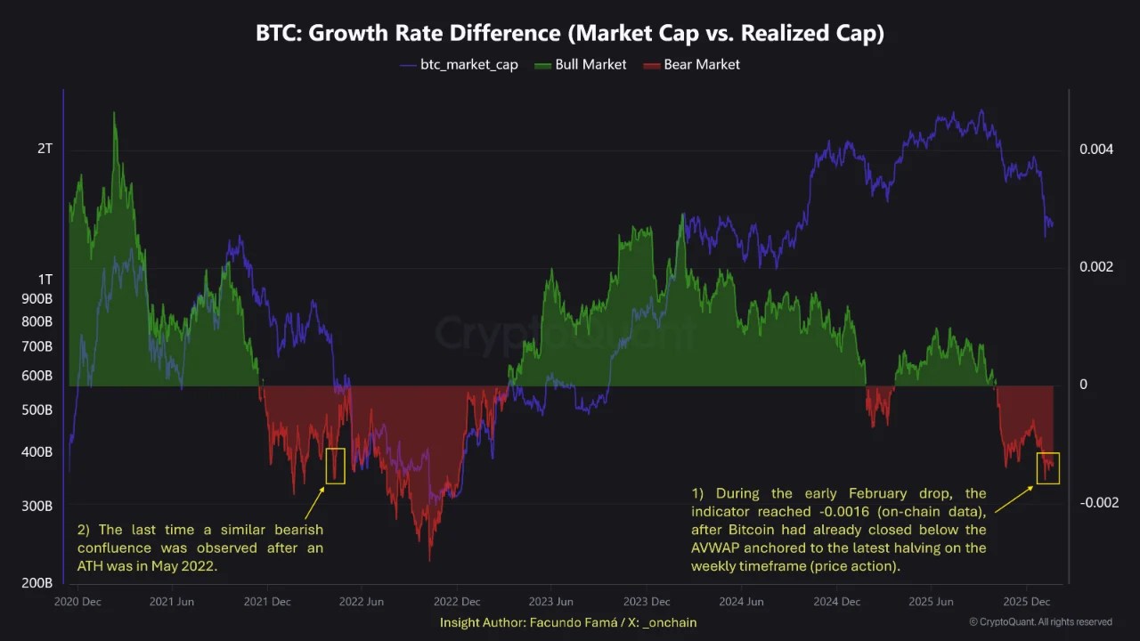 The report highlights that the last comparable bearish confluence following an all-time high occurred in May 2022, a period that ultimately preceded a prolonged corrective phase. According to the analysis, this comparison is based on a combination of structural indicators rather than isolated price action, specifically the BTC Growth Rate Difference between Market Cap and Realized Cap — an indicator developed by CryptoQuant CEO Ki Young Ju — alongside Anchored VWAP levels tied to the third and fourth Bitcoin halvings.