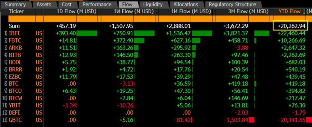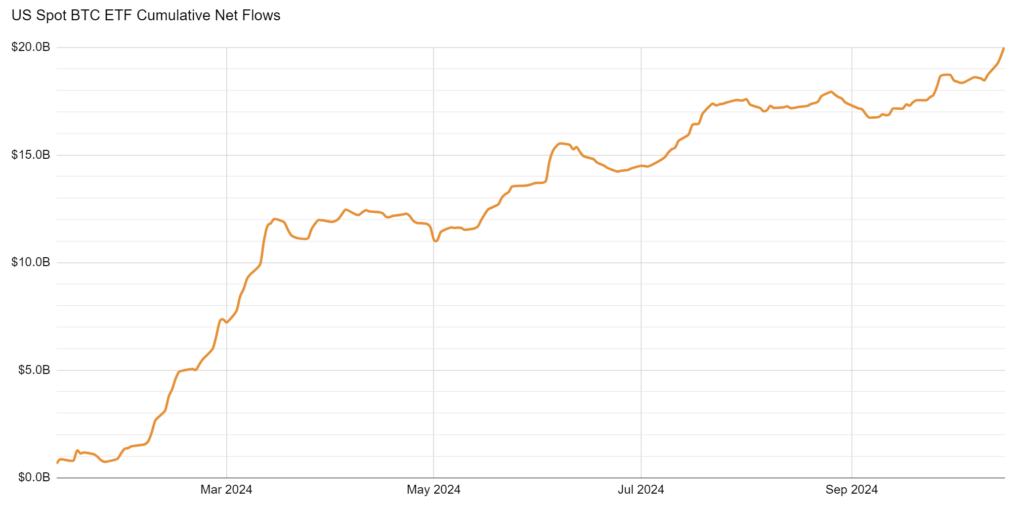 In fact, total net inflows into spot Bitcoin ETFs have surpassed $20 billion since their launch earlier this year. It took gold ETFs 5 years to reach this figure. That makes the Bitcoin ETFs the most successful debut of any ETF in history.