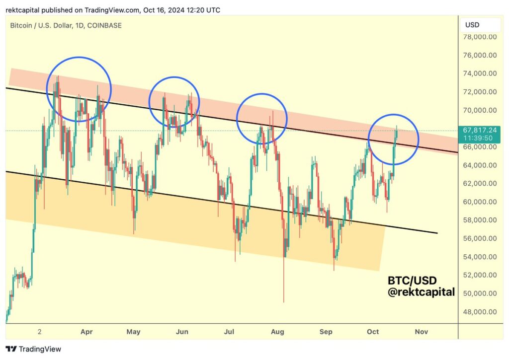 Analyst Rekt Capital echoes this sentiment, warning of a potential price crash if Bitcoin fails to close this week above $68,000, as has happened with similar attempts to break the current range.