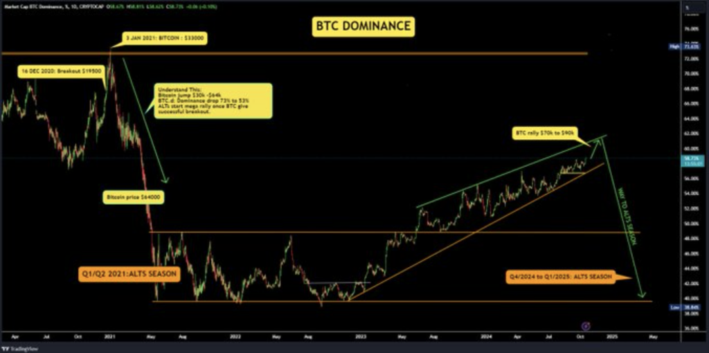 Bitcoin’s dominance has climbed from 57.69% at the start of October to over 58.8% currently. Crypto analyst Ash Crypto, posting on X, noted that if Bitcoin’s price reaches $80,000-$90,000 in the next 30 days, its dominance could hit 61%.