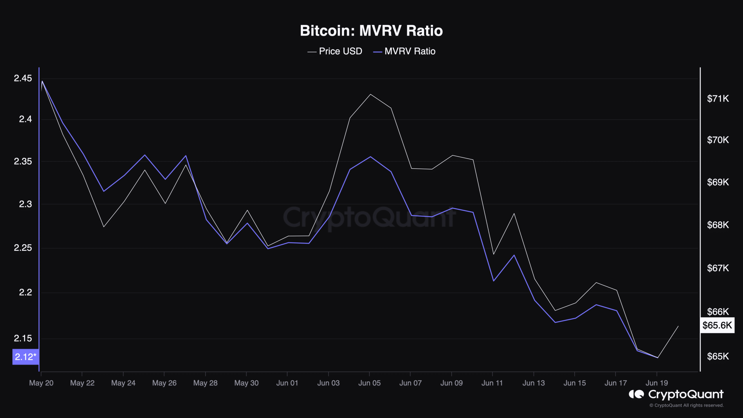 Delving into Bitcoin’s fundamentals, the MVRV ratio—a metric that compares the market value to realized value—has recently declined alongside the price, currently standing at 2.12, according to data from CryptoQuant.