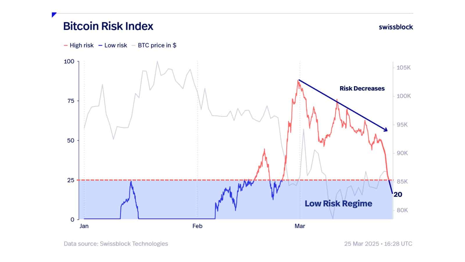 “Market risk easing…Now below the 25 threshold, signaling a shift into a low-risk regime. A key step in the bottoming process. Reduces the likelihood of a sharp drop but doesn’t guarantee a breakout.”