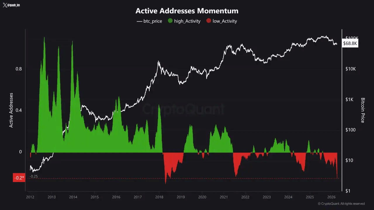 For instance, according to CryptoQuant, active addresses on the Bitcoin network have declined sharply since the start of this year, reaching levels not seen in nearly eight years.