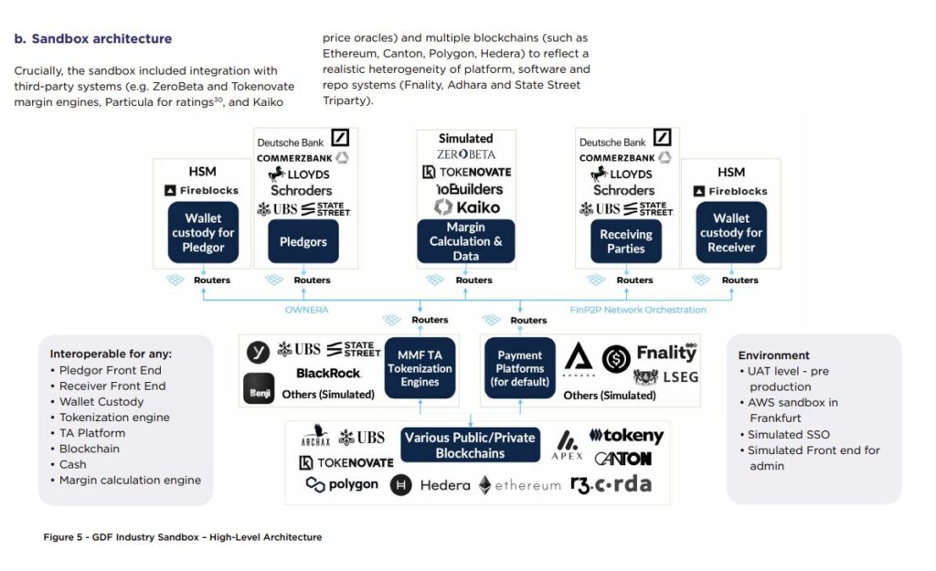 The architecture and participant list make it clear that this sandbox was built around interoperability, routing and orchestration across different systems. Ownera’s FinP2P routers are specifically mentioned in connection with the sandbox, and the simulations include cross-system workflows, third-party integrations, and links between legacy messaging and tokenized settlement. The report’s sixth simulation explicitly extended the infrastructure to connect legacy SWIFT-based margin messaging to on-chain collateral settlement.