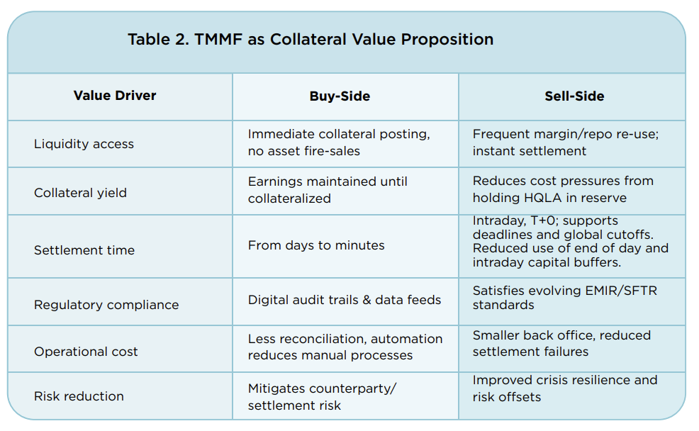 The report goes even further in its later sections, saying TMMF transfers can settle in seconds instead of the 1–3 day cycles typical of traditional MMF transactions, while supporting always-on liquidity and more seamless collateral posting.
