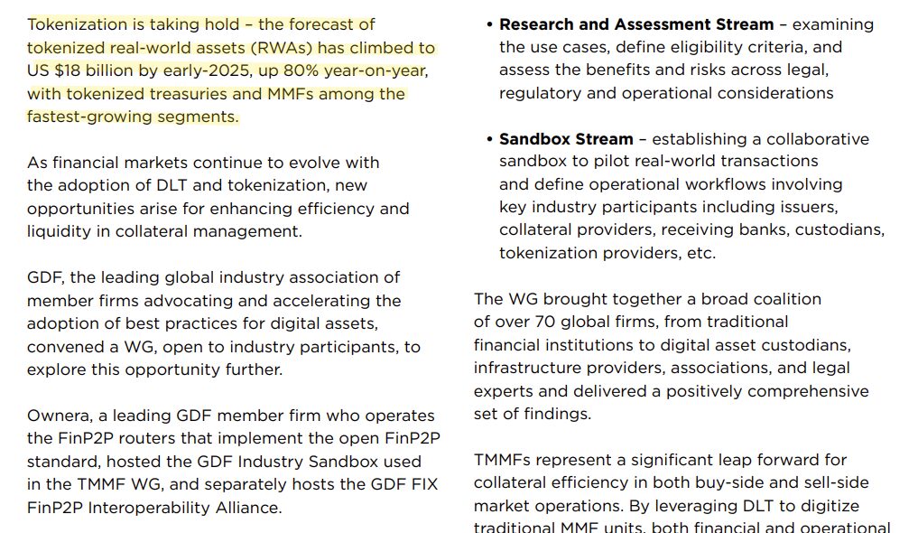 The report says tokenized RWAs had climbed to $18 billion by early 2025, up 80% year on year, with tokenized treasuries and money market funds among the fastest-growing segments. It frames TMMFs as a way to enhance efficiency and liquidity in collateral management, and as a practical bridge between traditional fund structures and blockchain-based settlement.