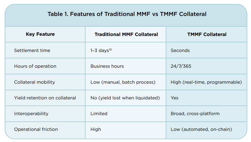 The report’s comparison between traditional MMF collateral and tokenized MMF collateral is striking. It says traditional MMF collateral typically takes 1–3 days to settle, operates during business hours, offers low collateral mobility and high operational friction. By contrast, the tokenized version is described as settling in seconds, operating 24/7/365, offering high real-time programmability and preserving yield on collateral.