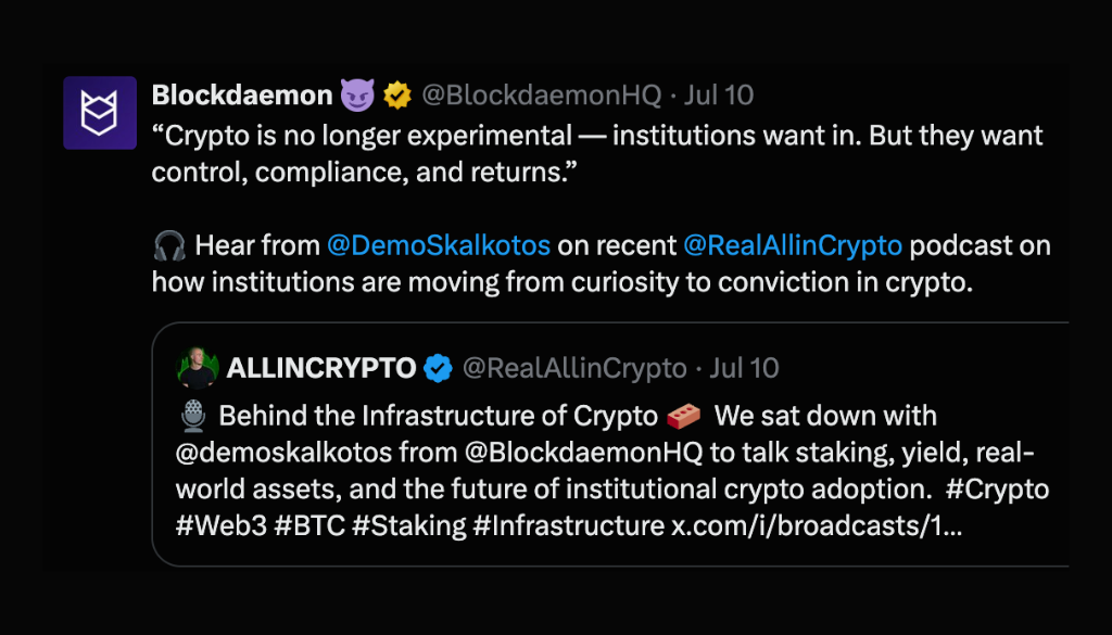 In a recent episode of the AllinCrypto Podcast, we had the pleasure of speaking with Demetrios Skalkotos of Blockdaemon, one of the largest institutional infrastructure providers in the crypto industry.