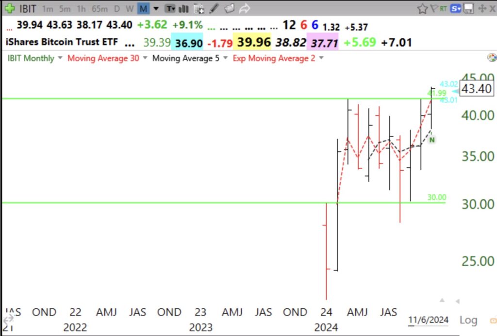 QQQ was very oversold but instead of dropping it found support and took off. Both my short term indicator and GMI reversed up. My longer term indicators had never signaled a major decline, however. I just was on the sidelines until the election passed. There were an amazing 811 US stocks at 52 week highs and 330 at an ATH! TC2000 sounded an alert when IBIT broke out and I tweeted about it intraday. This was an IPO GLB. The monthly chart looks like a flag pattern that may result in a continuation move the size of the earlier flag pole. Note Wednesday’s unusual volume.