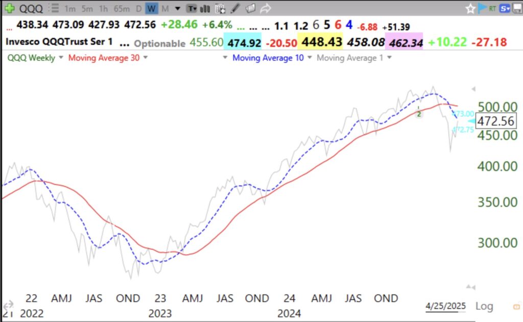 Look at this chart and see the current down-trend pattern of SPY. The 10:30 weekly chart of QQQ tells a similar story. While my short term indicator of QQQ has turned up, note that in any change in trend the shorter term indicator’s trend will change direction first but it does not necessarily mean the longer term trend will also change direction. When the longer term trend eventually turns up, the 10:30 weekly chart will tel me. Will the 2025 decline turn into one like 2022 or 2023? No one knows, but the 30 wk avg is turning down…..