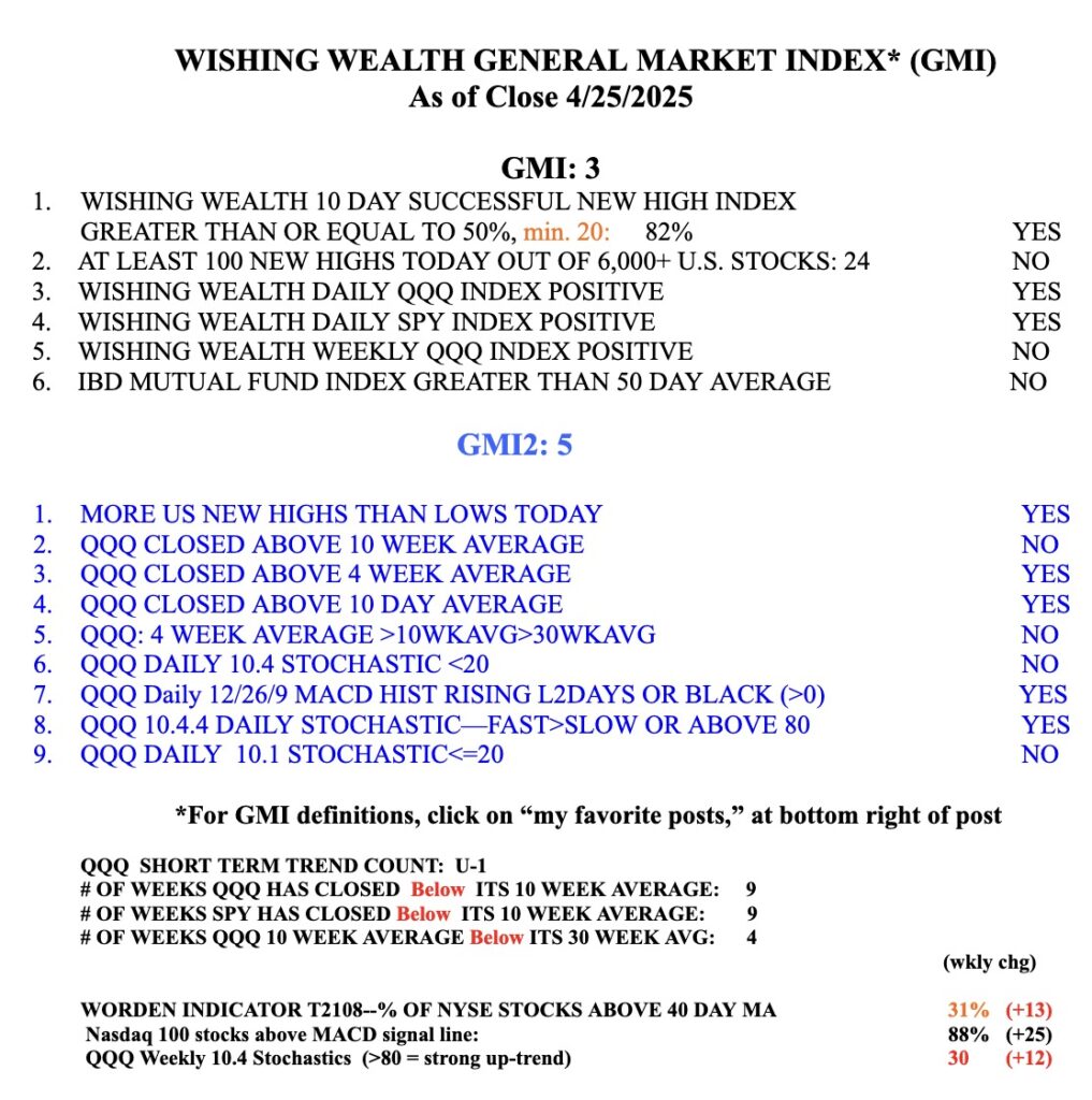 The GMI is now= 3 (of 6), and still RED. Near the bottom of the table I provide a count of the number of weeks QQQ has closed with its 10wk avg above or below the 30 wk avg.