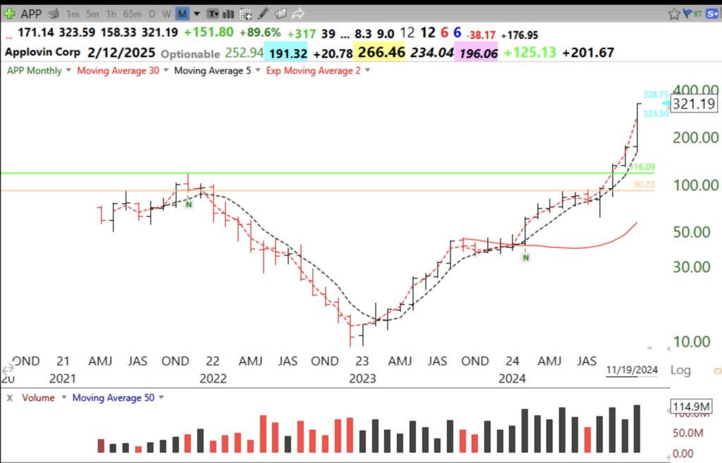 Blog Post: Day 10 of $QQQ short term up-trend; Here is a list of 17 growth stocks that reached an ATH on Tuesday, ranked by appreciation from a year ago; $APP is up 8x, see monthly chart and GLB in September at $116.09