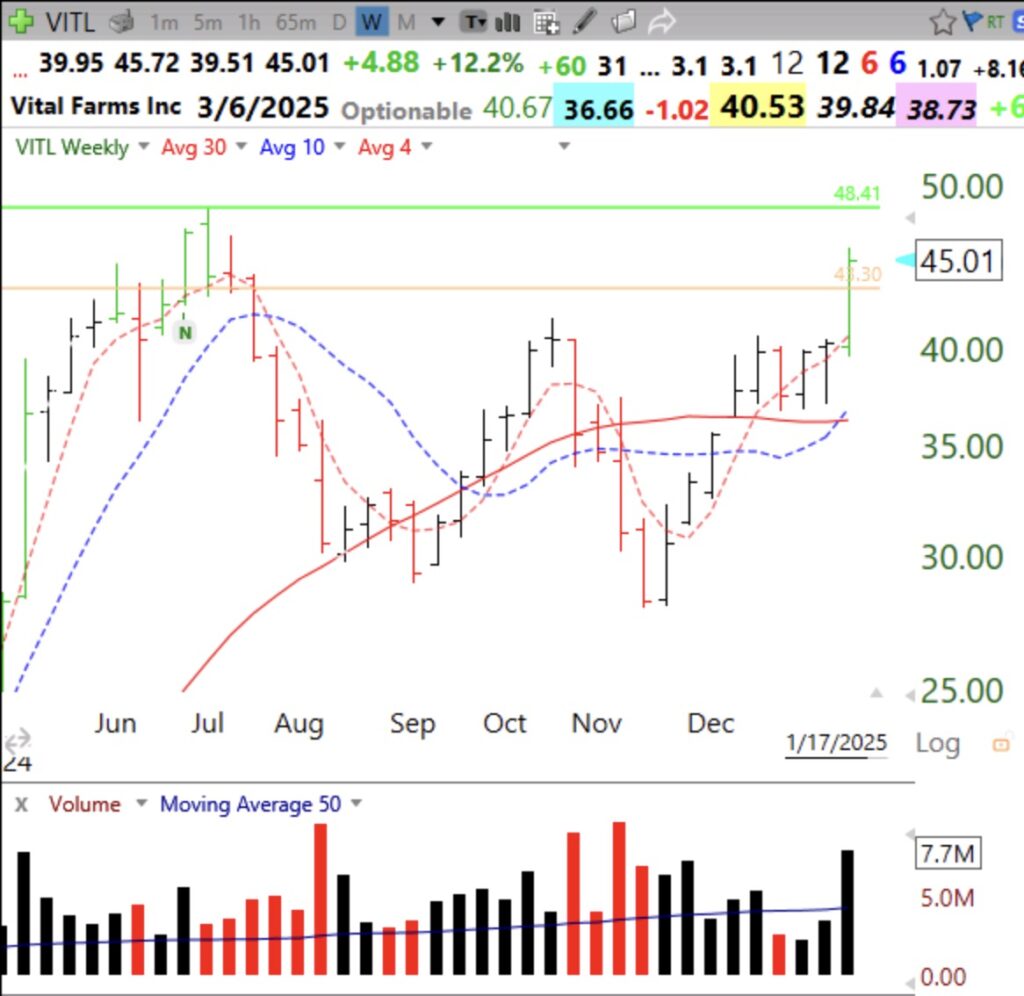 $VITL is nearing its green line, at 48.41. I put in an alert to tell me if it trades at 48.42. VITL has already tripled the past year and has an IBD/MS composite rating= 99. I never anticipate a break-out but wait for the break-out to happen. If VITL can CLOSE above 48.41 it will be a GLB. If I buy it, I will sell immediately if it closes back below the green line. This weekly chart shows above average volume last week and a possible cup and handle pattern. New users can sign up on this post to receive my blog automatically.