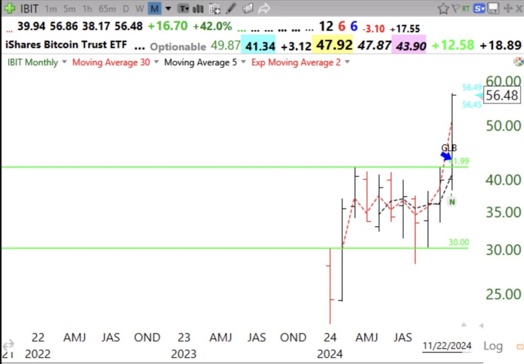Blog Post: Day 13 of $QQQ short term up-trend; GMI= Green and 6 (of 6); GLB and green dot called recent advance of $IBIT, see daily chart and monthly chart with flag pattern.