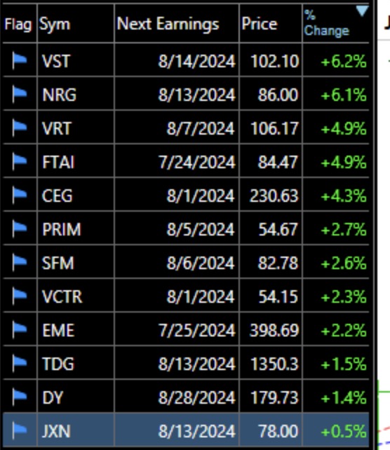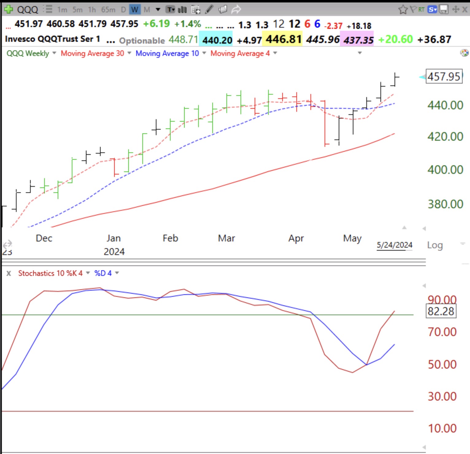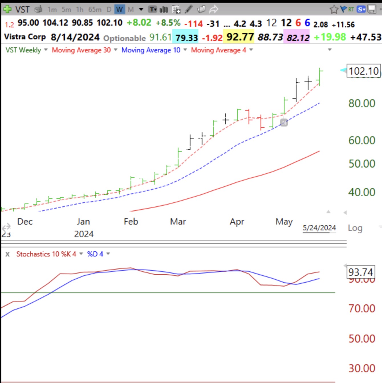 Hence my weekly green bar setup: The stock must have had its weekly 10.4  stochastic close above 80 for at least 5 weeks and the 4wk>10wk>30wk and the stock is at least up 50% from a year ago and reached a recent ATH and had a weekly green bar the most recent week. I sell if the stock closes the week below the 10 week average or the 4 week average is declining below the 10 week average. I also may sell if the stock trades below the low of the most recent green bar or the green bar at which I bought. I can put a sell stop in at that level if I bought after a green bar.