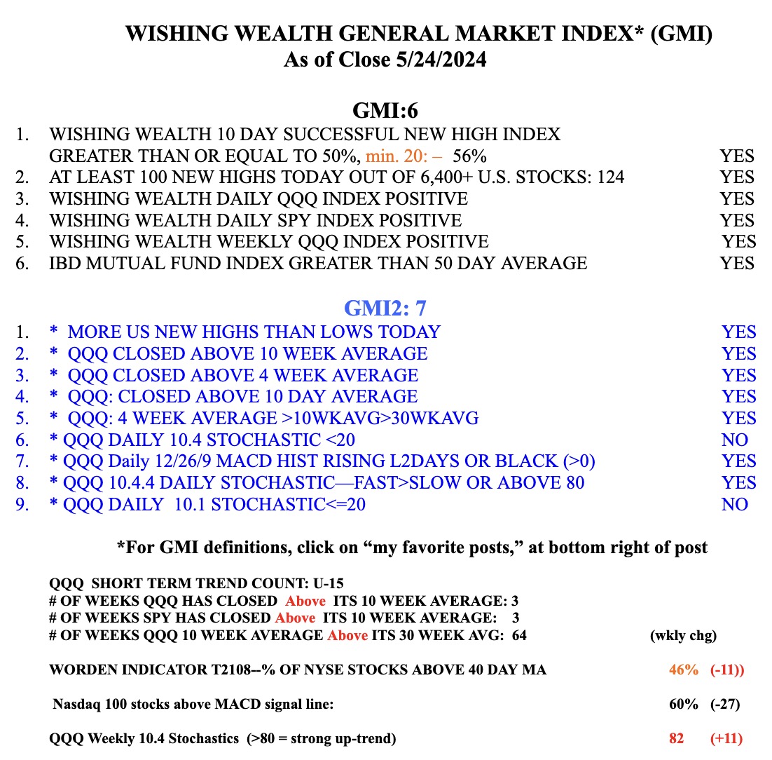 Of course , my weekly green bar setup requires an up-trending market, like the current one: GMI=GREEN and a current QQQ short term up-trend (see table below). Note that QQQ currently has a weekly 10.4 stochastic= 82. However, the recent bar is floating above the 4 wk avg, a sign of it possibly being extended.  Look at this chart to see what happened when the weekly bar was floating above its 4 wk avg. It typically came back to kiss it.